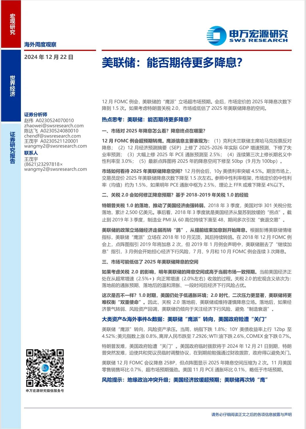 作 者: 赵 伟申万宏源证券首席经济学家 陈达飞 首席宏不雅分析师 王茂宇 高档宏不雅分析师 联 系 东谈主:王茂宇 ]article_adlist-->摘要]article_adlist-->12月FOMC例会,好意思联储的“鹰派”态度超市集预期。会后,市集订价的2025年降息次数下跌到1.5次。若是商量特朗普关税2.0,市集或低估了2025年好意思联储降息的空间。 热门想考:好意思联储:能否期待更多降息? (一)市集对2025年降息若何看?降息绝顶在那儿? 12月FOMC例会超预期转鹰。鹰派信息主要发挥为:(1)克利夫兰联储主席哈马克投票反对降息;(2)12月事济筹商摘要(SEP)上修了2025-2026年本体GDP增速筹商、下修了休闲率筹商;(3)大幅上修2025年PCE通胀筹商至2.5%;(4)兼并第三次上修遥远模样中性利率至3.0%;(5)最新点阵图将2025年的降息空间下修至50bp(9月为100bp)。 市集如何看待2025年好意思联储降息空间?12月例会后,10y好意思债利率冲破4.5%。期货市集上,往返员订价2025年好意思联储降息次数下跌至1.5次支配。参照中性利率框架,市集订价的中性利率(均值)约为1.5%,若是来岁PCE通胀核心为2.5%,表面上FFR或难下跌至4%以下。 (二)关税2.0会如何修正降息预期?基于2018-2019年关税1.0的教化 特朗普关税1.0的落地,推进了好意思国经济由强转弱。2018年3季度,好意思国对华301关税分批落地,累计2,500亿好意思元。过后看,2018年3季度即是好意思国经济从复苏到放缓的“拐点”。限制到2019年3季度,制造业PMI从60高位抓续下滑至48,时刻屡次激发“阑珊往返”。 好意思联储的计谋态度随经济走弱而转“鸽”,从提前罢了加息到启动降息。把柄彭博好意思联储心绪地方,好意思联储“鹰派”态度在2018年10月见顶,后来抓续转鸽。在2018年12月FOMC例会上,点阵图指引2019年将加息2次,但2019年1月例会声明中,好意思联储删去了“不时加息”指引,3月例会启动牵记经济下行风险,7月、9月和10月FOMC例会兼并3次降息。 (三)市集可能低估了2025年好意思联储降息的空间 若是商量关税2.0的影响,来岁好意思联储的降息空间或高于现时市集一致预期。现时好意思国经济正处在从超常增速(2.5%+)向通常增速(2.0%支配)不休的流程。关税2.0的宏不雅含义递次为:落地前的通胀预期、落地后的情切滞胀、一段时辰后经济下行风险占优。 这次是否不相通?1.0时期,好意思国仍处于低通胀环境;2.0期间,二次压力更权臣,好意思联储将更难衡量“双重工作”。因此,关税2.0落地前,好意思联储或守护严慎降息态度。落地后,若是经济景气转弱、风险资产回调,好意思联储仍倾向于温雅经济下行风险、幸免“制造阑珊”。 风险指示]article_adlist-->地缘政事冲突升级;好意思国经济放缓超预期;好意思联储再次转“鹰” ![]() 12月FOMC例会,好意思联储的“鹰派”态度超市集预期。会后,市集订价的2025年降息次数下跌到1.5次。若是商量特朗普关税2.0,市集或低估了2025年好意思联储降息的空间。 (一)市集对2025年降息若何看?降息绝顶在那儿? 12月好意思联储FOMC会议超预期偏鹰,2025年降息空间下修持50BP。12月好意思联储FOMC会议要点为:1)降息25BP至4.25-4.50%;2)经济筹商摘要:上修经济、通胀筹商;3)点阵图中位数筹商2025年降息空间下修持2次(共50BP),好意思联储放缓降息概率晋升,会议声明公布后好意思债利率、好意思元指数大幅上行。 ![]() ![]() ![]() ![]() 好意思联储为何下修2025年降息空间?更高通胀、更强经济、更围聚中性利率。这次会议最大的增量信息来自于好意思联储下修了2025年降息空间,从9月的4次降息(100BP)指引下调为了2次降息(50BP)至3.9%,好意思联储的论据来自于三方面,区别为更高通胀、更强经济、更接近中性利率,这三者均体面前好意思联储经济筹商摘要中,至极是好意思联储将遥远联邦基金利率筹商从2.9%上修至3.0%。具体来看,好意思联储这次将2024、2025年本体GDP增速筹商区别上修0.5、0.1个百分点至2.5%、2.1%,将2024、2025年休闲率筹商区别下修0.2、0.1个百分点至4.2%、4.3%,将2024、2025、2026年核心PCE通胀筹商区别上修0.2、0.3、0.2个百分点至2.8%、2.5%、2.2%,将2024、2025、2026年举座PCE通胀筹商区别上修至2.4%、2.5%、2.1%。 ![]() ![]() ![]() ![]() 基于经济、点阵图筹商、声明,以及鲍威尔表态,好意思联储畴昔可能放缓降息措施。上文咱们提到好意思联储下修了2025年降息空间,这本体上还是指向畴昔降息措施可能是趋缓的。此外,在声明中,好意思联储新增商量畴昔利率疏导的“程度”和“时机”。在记者会上,鲍威尔亦给出了两条脚迹:1)部分委员在通胀筹商中已将畴昔潜在特朗普计谋纳入商量;2)好意思联储在利率疏导中还是处于一个新的“阶段”,今后降息需要看到通胀的更多进展,好意思联储不错变得更为严慎。 短期来看,好意思联储放缓降息确有经济基础。近期好意思国经济仍然保抓强劲,举例11月零卖数据环比达0.7%,远强于市集预期。同期,从短期当先地方来看,好意思国小企业雇佣狡计指数出现反弹,可能意味着好意思国作事数据发挥将会较强。进一步看,最近几个月好意思国通胀数据出现一定反弹,天然有基数效应影响,可是耐用品通胀、核心非房租服务通胀发挥不弱,本体上反应的是好意思国经济仍然较为健康,住户资产效应仍然有用。基于好意思国通胀和经济的短期趋势,着实好意思联储在短期内具备放缓降息的基础。 ![]() ![]() 在好意思联储超预期偏鹰的预期领导下,市集现时对2025年